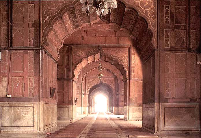 Interior of the worship hall of the Jami Masjid (Friday Mosque), Delhi, 1650-56. It is entirely finished with red sandstone except for the lowest parts of the walls.