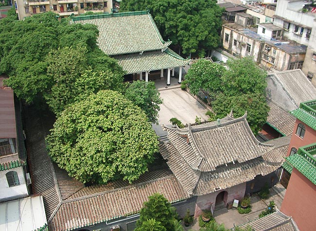 An aerial view of the Huaisheng Mosque of Guangzhou seen from its minaret. The Great Hall is at the inmost place and the Moon Watching Tower before the courtyard.