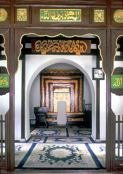 Looking at the Mihrab at the inmost place of the Rear Mihrab hall in the Songjiang Mosque. There is a buffer zone before the Rear Mihrab Hall, lighted from windows on both sides.