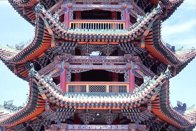 The gaudily painted middle part of the minaret of the Laowan Mosque. Its eaves are extremely bended up unlike Japanese traditional temple architecture. It can be designated as 'Chinese flamboyant style'.