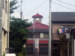 ![]() ■谷保の旧家街道は本国道と合流し、西へ谷保天神をめざして行く。途中右側にめずらしい時計台のある家と門を構えた元名主のような旧家があり、こちらは歯医者さんでした。 |
