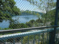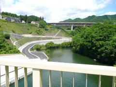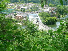 ●日蓮大橋沢井川を渡ってから電気店の所を右へ曲がっていく。この旧道は藤野中学校の前を通って、すぐ国道へ合流してしまう。やがて藤野駅に近づくが、手前に相模川に架かる日蓮大橋が印象的だったので撮っておいた。藤野駅を通過しその先で中央線を越す。その先の集落が次の関野宿になる。藤野駅付近の国道は細く、歩道も片方しか付いていない。歩道も狭いし歩きやすいとは言えない。 |