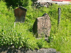 ![]() ●ひかえ宿小松屋小原宿は本陣のほかにも旅籠風の建物も見られる。「細見」のひかえ宿小松屋と思われる?建物 ●南無阿弥陀仏碑 宿外れの右手の土手に建つ南無阿弥陀仏碑。頭が欠けている。字体が変わっている。その後国道から公園の方へ降りていく道が旧道で右回りして又国道に戻る。 |