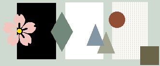 | 上図のようにこの保存形式ですと、どんな背景色や柄の上にも載せることができます。 ですがご覧の通り矩形以外は、画像廻りのジャギー(輪郭線のギザギザ)が 物によっては目立ちます。これはグラフィックソフトの滑らか機能 アンチエイリアス(画像輪郭のぼかし)をOFFにした状態と同じです。 そこで登場するのが「〜 マット透過 gif」です。 |