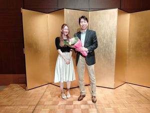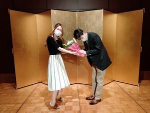 | 金子朋世(高67回生)から、田中 様に花束 を贈呈いたしました。 |