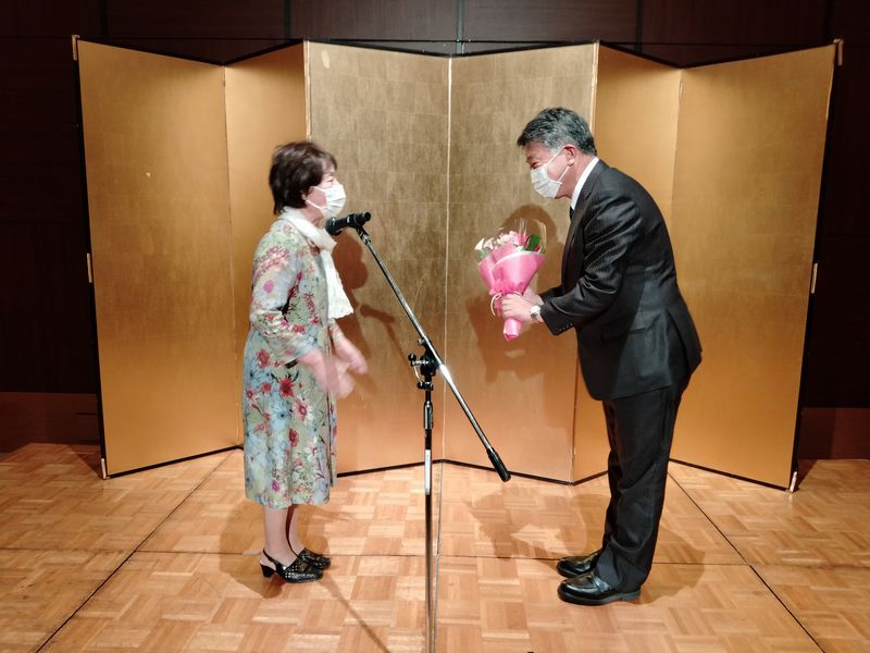 橋本数子 様(高15回生)から、金澤 様に花束 を贈呈いたしました。 |