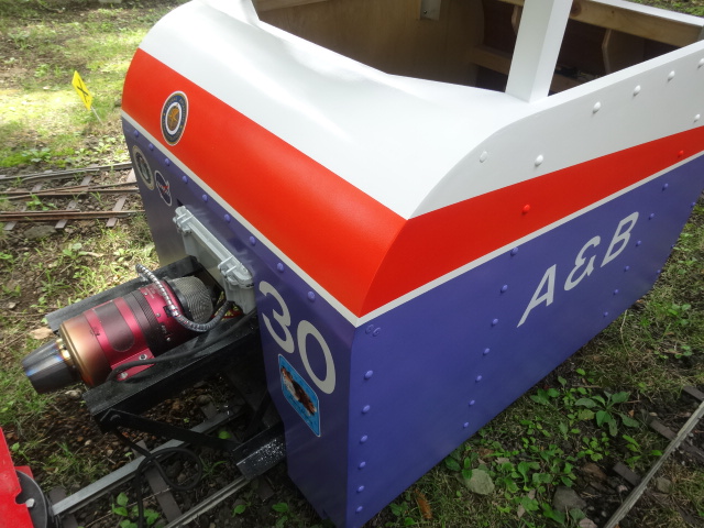 一番新しい30号機は、ジェットエンジンで推進する機関車になりました。推力10kgfの模型(飛行機)用のエンジンを後部に搭載し、噴射による推力のみで走行します。運転士は、機関車の中に乗り込み、スロットルとブレーキを操作して走ります。3%の上り勾配からスタートすることも可能。