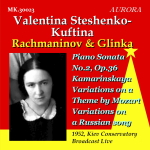 ヴァレンティナ・ステシェンコ・クフティナ(1904-1953)は、現在のウクライナ・ハリコフ(ハルキウ)の生まれ。キエフ音楽院でフェリックス・ブルーメンフェルトに師事(ホロヴィッツやシモン・バレル、グリンベルクと同門ということになる)、また短期間アレクサンドル・ゴリデンヴェイゼルに習ったとの記述もある。1923年同音楽院を卒業後、1925年から1935年まで同校で教鞭をとる一方、1924年から1930年までキエフ、モスクワ、レニングラードでコンサート活動を行った。またリャトシンスキー作品の最初の演奏者となり、リャトシンスキーはピアノ・ソナタ第1番(1924年)を彼女に献呈している。ピアニストとしての活動と共に、夫が考古学者・民俗学者のボリス・クフティンだったこともあり、1928年以来、民俗学の記録と研究も行い、ケルチ半島、極東、北オセチア、ジョージアの民俗学的調査に参加、著書も数冊執筆している。しかし1930年、夫が政府から反革命活動の容疑で逮捕されて3年間の追放処分となり、夫婦で1933年まで西部ヴォログダ州クベンスコエという村に隠遁。地元の合唱団の指導を行った。追放解除後は1952年までトビリシ国立音楽院でピアノを教えた(1942年から教授)。1936年には「現代音楽における民俗ジャンル」というテーマのコンサートを開催し、ピアニストしての活動も再開した。