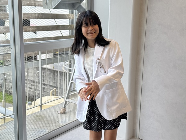 (院長室で子供たちが白衣を着けてにこやかにポーズです。)