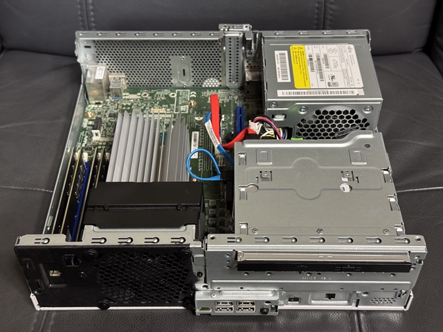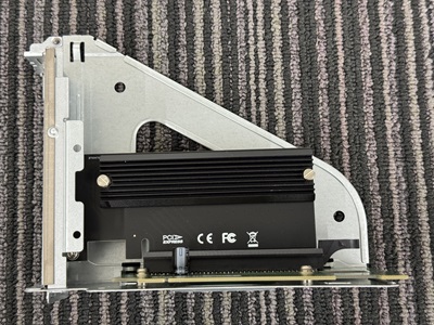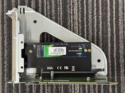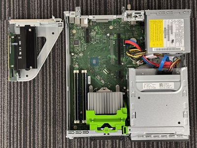 | ESPRIMO D587スリムデスクトップパソコンです。 | ライザーカードを取り外しました。 | アルミヒートシンクを外してM.2SSDを取り出します。 | PCIeドーターカードに装着したM.2SSDです。 |