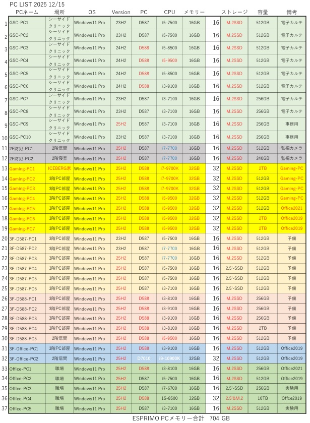 PCリストと DDR4メモリー集計(704GB)