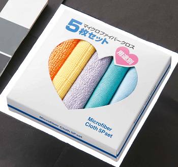 参考上代(税抜)¥400マイクロファイバークロス(5枚セット)《34-51》●異色マイクロファイバークロス5枚入り用途別に使えるマイクロファイバークロスを5枚セットしました。印刷箱:125×125×30 本体:200×200×3 材質:ポリエステル・ポリメイド 原産国:中国 65g 5色セット