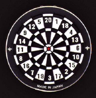 参考上代(税抜)¥1,500 スタンダードダーツセットS-25《S-25》●矢3本・吊金具・取説中身は本格的、ダーツゲームのスタンダード品。印刷箱:260×260×22 本体:φ250×高15 材質:ロールペーパー・ABS・鉄 原産国:日本 500g