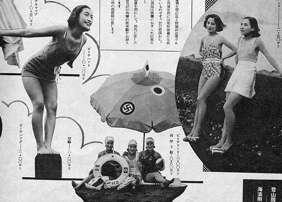 1938年の松屋デパートの広告です。日本が中国侵略を始めて1年たった夏の夏休みまえのデパートの広告です。全て女性モデルで上半分は山への行楽着した半分が上にあるように水着の広告です。デザイン的には今でも通用するかなと思います。ちなみに、モデルさんが存命なら、80歳(二十歳だとして)になります。古き良き時代の光景です。よくみるとビーチパラソルの模様が「日の丸」と「かぎ十字」、世相を映しています。国家権力(軍部)の広告出版への介入があったと思われます。この広告はパラソルの柄にきなくさいにおいを感じるのですが、他の広告を見ると、戦闘機が写ってたり、国威発揚的な文言がありました。まあ、庶民には流行の水着なんぞ、当時は贅沢な広告なのでしょう。一見平和そうに見える広告のなかに、何かを感じてしまいました。