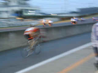 スタートの秒読みに入る。そばには、ペアを組む笹原さんが着いていてくれる。 「落ち着いて、レースを楽しんで!」 そして、運命のスタート。 スターティンググリットは、コース幅の両側に配置されている。スタートと同時に、コース両側から一気に合流し、ひとつの流れになって、レースが始まる。発動機を持たない自転車ならではの、静かなスタート。聞こえるのは、風の音と、「サー」というタイヤのロードノイズだけ。点滅するテールランプの赤い光が、とても幻想的で、自分が川の流れの一部になったような、不思議な感覚を味わう。 実際に走れば分かるが、レースの最中は、コースに沿って川の流れのように空気が流れているのだ。大きな集団の中では、大きく強い流れがあり、小さな集団の中では、小さく弱い流れがある。その流れをうまく利用して、体力の消耗を抑えるのだ。 最初の目標である30分を走り切り、ピットイン。笹原さんにバトンタッチした。すでに、体力を使い切ってしまった…