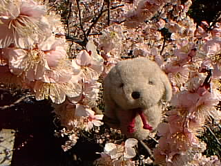 春爛漫!うめは梅の木に登って記念撮影! でも高いとこはちょっと苦手・・・ わんわん♪