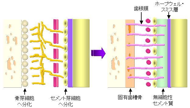 歯根象牙質や支持歯槽骨と接触していない部分の未分化間葉細胞は歯根膜(=しこんまく)へと分化します。歯根膜線維の一部は無細胞セメント質と固有歯槽骨の中へ取り込まれます。