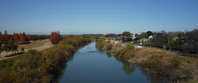 押切橋で左岸から右岸へ移動。橋を渡るだけで15分近くかかります。こうして眺めていると、とても氾濫するような川には見えませんが、広い川幅も荒れた時に備えてのものなのでしょう。 |