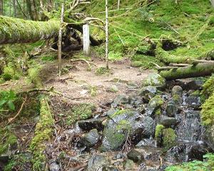 沢沿いを歩いていると、ほどなく軌道跡に出くわす。狭い道の上を延々と軌道が続いている。これ、材木を運び出した森林軌道の跡だそうである。よくぞまぁ、こんな所に敷設したものだと感心するが、同時に驚いたのが、この軌道が戦後に作られ1970年まで使われていたものだという事実。もっと年代物かと思っていました。日本経済の発展は、かくも急速なものだったのでしょう。 |