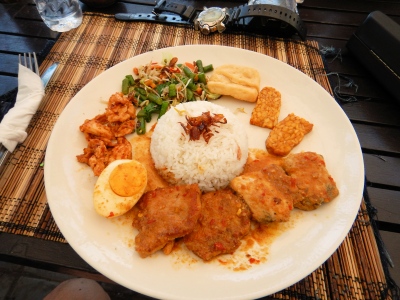まずはランチを何にするか決めました。ホテルのおすすめは「ナシチャンプル」ということでガイドを含め3人ともナシチャンプルに決めました。肝心のダイビングの方はまあまあでしたが、ランチのナシチャンプルが大当たりで、とてもおいしくいただきました。とてもいいお天気で去年のような涼しさがありません。