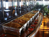 | ダイニング | ダイビングでシパダンに行っている時の昼食以外は三食ともここで食べる。朝食は7:00~、昼食は13:00~、夕食は19:00~でいずれもビュッフェスタイルになる。昼と夕は主食がご飯、ジャガイモ、パスタから2品、肉料理と野菜料理が4品、野菜料理が2品、フルーツが2~3品、サラダ、日替わりスープ、デザートになる。鉄板焼きコーナーでハンバーガーなどを作るときもある。朝は焼きそば、ハム、豆などの他、オムレツコーナーで、リクエストでオムレツ、目玉焼き、ワッフルなどを焼いてくれる。水、オレンジジュース、コーヒー、紅茶は無料で飲めるが、アルコールや缶ジュースは有料。 |