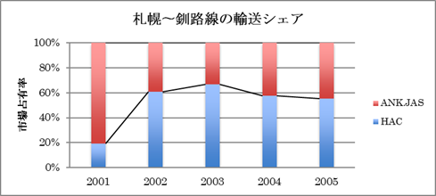 札幌〜函館線では機材差、提供座席数の違いが大きいせいか。運賃の影響は大きく出ていない。 一方札幌〜釧路線では増加傾向にあったHACの市場占有率が、2003年度をピークに下降に転じており、それは運賃の影響ではないかと推察するのである。