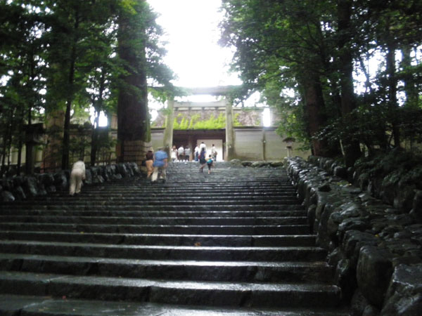 1泊2日でカミさんとお伊勢詣りに行って来ました。 旅のスタートは朝5時の起床からです。 11時前には伊勢の外宮に到着。 3つの別宮を廻ったところで雨が、、 御正殿のノキを借りてしばらく雨宿り。 激しい雨もおさまり外宮を後にうどんやへ。 「伊勢うどん」なかなかのお味でした。 お腹も落ち着きバスで内宮へと向います。 食後のデザートは勿論赤福本店で。 宇治橋を渡り御詣り再会。 内宮での参詣も無事に済み今回の目的のひとつ 御祈祷をして戴きました。 夫婦2人での神楽殿の中は身の引き締まる思いです。 式年遷宮の献納をすると正宮の中で拝殿が可能とのこと。 再び御正宮へ戻り先程より近いところから御詣り。 すがすがしい気分で内宮を後に。 芸能の神である天宇受売命(あめのうずめのみこと)が 祀られている猿田彦神社を経て月讀宮へと向いますが 少しペースが遅すぎたのか辺りが暗くなり始めました。 夜をつかさどる神さまを祀る月讀宮の参詣が済み 本日の予定終了。 森の中は真っ暗に。 そして脚は棒のように! 良く歩いた御褒美で 夕食はディナーコースを頂きました。 1日目が無事に終わり曝睡。 お伊勢詣り(2)へと続きます。 |