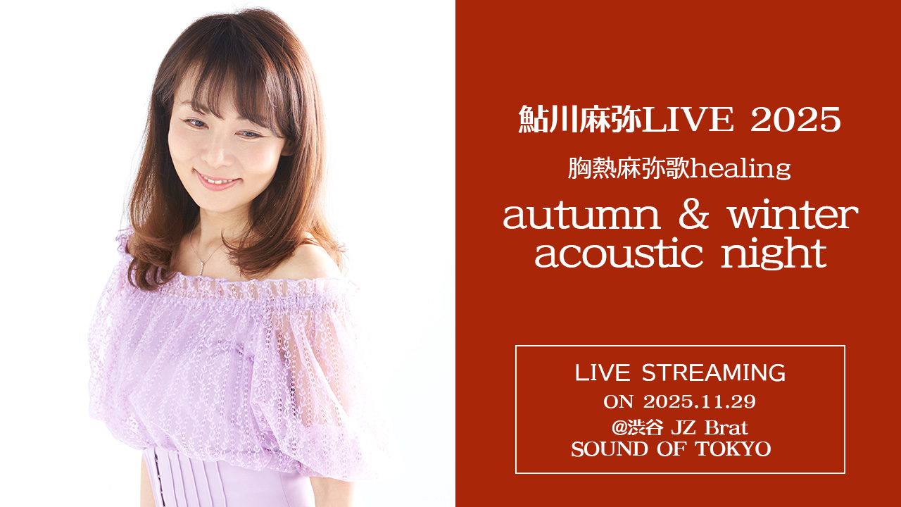 ツイキャス配信決定!!![]() 鮎川麻弥LIVE 2025 〜胸熱麻弥歌healing〜 autumn & winter acoustic night @JZ BRAT SOUND OF TOKYO 長く愛され続けるアニソンとオリジナル曲を、秋冬らしく優しいアコースティックサウンドでお届けします。 梶原順(Gt)率いる豪華メンバーの美しい演奏とともに、上質な癒しの麻弥歌をご堪能ください。 【チケット購入&詳細】はコチラからどうぞ↓↓↓ https://premier.twitcasting.tv/c:gnmusic/shopcart/387688 | ||||||||||||||||||||||||||||||||||||