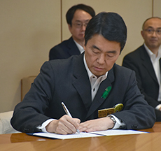 村井知事は、「核兵器を無くすのは唯一の被爆国である日本の大きな一つの国是ではないかと思っている。全世界の全ての人類がこの署名に賛同すれば、間違いなく核兵器を無くす事が出来る。一人ひとりの署名を求める活動は非常にエネルギーがいるが、大変重要な取り組みであると考え私も署名させて頂きます」と述べ署名しました。