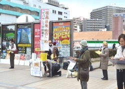 千葉県「ヒバクシャ国際署名」推進連絡会は2月17日7回目の統一行動をJR松戸駅前で30人(うち被爆者14人)が参加して行ないました。13時30分から1時間の予定で署名をはじめましたが、20分経過した頃から風が強くなり、横断幕も風にあおられ、署名用紙もパタパタする中、各団体がリレートークでマイクを持ち、寒さの中の1時間の行動を終えました。