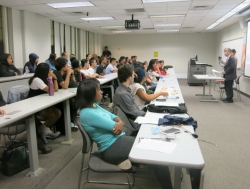 夜は、ニューヨーク市立大学ラガーディアコミュニティカレッジで濱住治郎事務局次長が証言しました。50人近い学生の参加で、日本語を学ぶ学生のお世話もあり、ヒバクシャ国際署名に41人が署名しました。