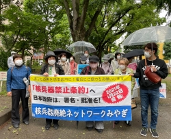 宮城の署名呼びかけ人で東北大学名誉教授の板垣乙未生さんのあいさつ、医師の水戸部秀利さんからのメッセージが読み上げられ、ロシアがウクライナ侵略の中で核兵器使用の威嚇を公言している情勢を指摘するなど、心の込もったあいさつに涙を浮かべる参加者もいました。三田福子さんはパネル展や平和の鐘など新婦人の会の多彩な活動を紹介し「日本の政治家の核共有発言は許せない」と決意を述べました。その後、手作りのプラカードや横断幕を手に「みやぎから核兵器廃絶の声を」とパレードを行ない、平和ビル前での署名行動に取り組んで、核兵器廃絶をかかげた22日行動を締めくくりました。(核兵器廃絶ネットワークみやぎ)