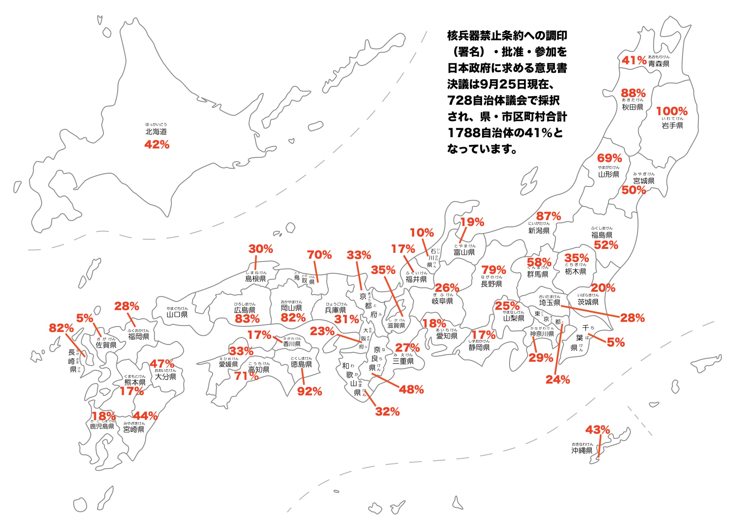 2.今年度末(来年3月末)までに、「日本政府に核兵器禁止条約の署名、批准を求める署名」を諸団体の署名と合わせて500万に、地方議会決議を全自治体議会の50%超を目指す(現在の数について別表と地図を参照)=このため、10月を署名と地方議会決議促進月間とし、11月に署名提出を含む中央行動を行ないます。署名提出は、これまで日本被団協が集めた約120万人分の署名(これまで提出は目録と一部の署名のみ)と前回提出以降に集められた署名を積み上げ、提出します。署名提出集会後は、議員会館前で、日本政府が核兵器禁止条約に署名、批准するようアピール行動を行ないます。この行動には原水協・原水禁をはじめ市民団体との共同の行動として呼びかけ、話し合いを進めます。