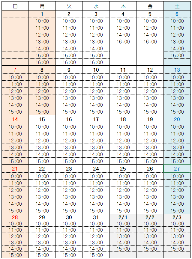 10:00、11:00、12:00、13:00、14:00、15:00の6回です