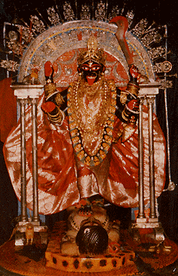 シヴァ神の神妃ドゥルガーの怒りから生まれた。カーリーとは、「時間」と「黒色」を表す語「カーラ」の女性形であり、横たわる絶対の象徴であるシヴァ神の上に立つ「動的な力(シャクティ)」である。 ベンガル地方で、特に崇拝されている女神である。