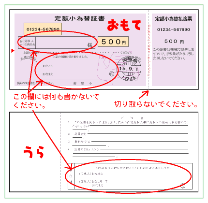 ●2006年3月現在、100円、200円、300円、400円、500円、1000円の定額小為替があり、一枚買うごとに10円の手数料が必要です。