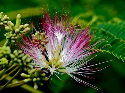 ネムノキ(合歓木) マメ科 花期:夏 淡いピンクの傘状に見える花は 実は数十本の細長い雄しべを持つ花が10個、20個と集まってできた姿で、 本当の花びらは茎に小さく付いているそうです 画像下は実です