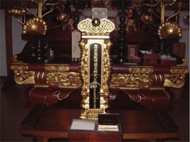 祖父の位牌を祖母の位牌と共に位牌堂の中に収めた。位牌堂の中には代々の当主とその奥方の位牌が並べられている。 |