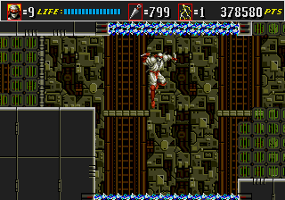 エレベーターの左端か右端にいると戦いやすい。浮遊メカは出現と同時に破壊すること。砲台が出現したら、弾をジャンプでかわしつつ手裏剣で破壊。 |