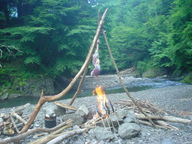 ◆焚火の上に薪で三脚をこしらえ、針金で吊るす。