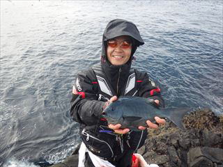ウキ下1ヒロで流していると・・・爆天にアタリが!35cmのメジナだ!