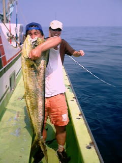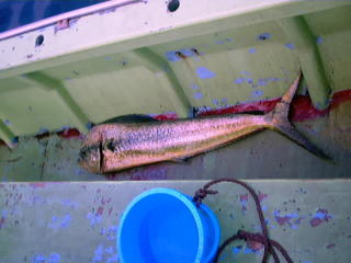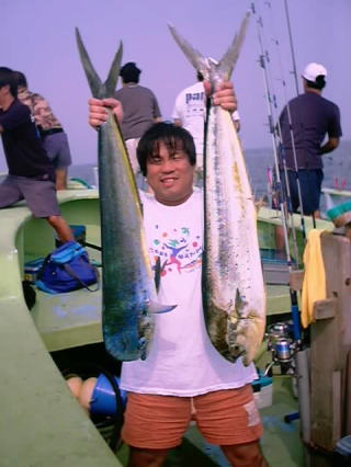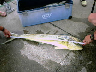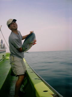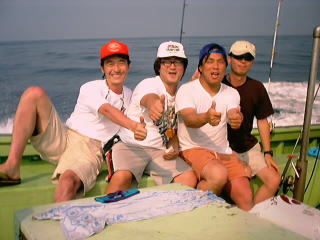今年も「銀座楽釣会」のメンバー4人が集まることになった。この会は私が東京に赴任していた頃、よくシイラ釣りに行っていた仲間で結成しているもので、恒例となりつつある夏合宿も今年が2回目。現在、メンバー中3人は東京を離れており、全員が集まれるのも年に一度が精一杯である。それだけに待ちわびた週末だ。新横浜駅でメンバーのひとり横山氏と合流。今晩の宿となる田苗氏の会社の社宅へと急ぐ。ここで菅原氏も含めた4人が勢揃い。ビールを飲みながらの釣り談義が始まる。なにせ1年ぶりであるから話は尽きない。菅原氏は北海道に住んでいて最近75cmのイトウを釣り上げられた。写真の美しい魚体に一同感心。田苗氏は鳥取に住んでいて、最近はオフショアでのシイラ、青物を中心に釣りをエンジョイしている様子。横山氏は今回のため?車を新調し準備万端。気が付けば3時になっていた。出船は6時なので5時には出発だ。各自大漁を夢に見ながら床についた。