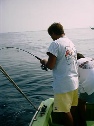 心躍る一日目。逗子の海岸の風景が懐かしい。港に着くと、我らがマザーシップ・まさみ丸の姿があった。そして鶴三船長の笑顔。いよいよだなあと感じる。霧でやや見通しが悪いものの、雨の心配はなさそうである。海上は若干のウネリが残っているが、これぐらいなら凪のうち。いい釣りができそうである。午前6時定刻通りに出船。土曜にもかかわらず乗船したのは12名ほど。左舷のベストポジションを確保し海原を凝視する。この釣りは魚の群れを自分で探すことも楽しみのひとつなのだ。出船して20分ほどで船が速度を緩めた。トリヤマである。そして期待のファーストキャスト。しかし、ミノーには反応がない。ルアーをビバパレードに変えて得意の超早引き。すると一発で乗ってきたが手ごたえが弱い。上げてみるとメジ(マグロの幼魚)の幼稚園サイズ。秋にはこれが大きくなっていいファイトを見せてくれるのだが・・・。ダメな群れにはさっさと見切りをつけるのもこの釣りの特徴。船は沖を目指して走っていく。