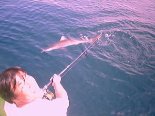 ットに至らない。大物を仕留めたこともあって後方待機を決め込んでいたが、この状況に少々痺れてきた。トリヤマに到着直後、舳先が一人分空いている。我慢できず「お邪魔」と声をかけて割り込みジグをキャスト。一発で乗ってきた。このぶるぶるという感触はうれしいあの魚か。予想通り、浮いてきたのは本ガツオの良型。いいオカズができた。再び後方に回って様子をうかがっているとナブラが横にぶれて、私の前方にやって来た。チャンス。ナブラの頭を押さえる形でルアーが入水した。と同時にドラグが唸りをたてる。一瞬鳥が引っかかったのかとも思ったが、すべて飛び立ったあともラインは海中に突き刺さっている。そして次の瞬間今まで体験したことの無いような突っ込み。マジでリールが壊れるのではないかという恐怖を感じるほどにスプールが滑る。瞬く間に糸が引き出され、残りがわずかになった。たまらず船長にアシストをお願いする。こんなことは初めてだ。何が掛かったのだろう。幸い、魚がこっちへ向かってきたようで、だいぶ糸がストックできた。船尾の方に回りこんだ魚に合わせて後ろへ走ったその時、何かが跳ねた・・・・「サ・メ・か」。そう、2メートルはあろうかというサメがヒットしてしまったのである。それにしてもすごい馬力だ。でもサメと分かった以上あまり時間もかけられない。ドラグ締め付けてラインブレイク覚悟の勝負に出る。ところがこれだけ締めてもラインが出て行くのだ。ギャラリーが集まってきた。こうなったら寄せるしかないだろう。竿のパワーにものをいわせ力任せのポンピング。徐々に抵抗が弱まってきた。そしてついに寄せきった。暴れるサメとの記念撮影。ギャラリーから拍手が沸く。危ないのでランディングせずに糸を切ったが、間違いなく私がこれまでに掛けたなかで最大の生命体であった。