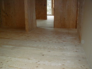 2000年10月7〜9日 DK床合板下貼り DKの下貼りで大判の合板を4枚横一列に貼ったところ。奥の方は厨房設備が置かれる場所にあたり、床スラブに工事が必要なので配置していない。 |
