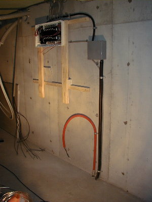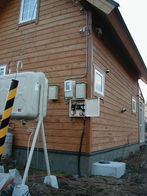 2000年10月25日 電源ケーブル接続 山小屋での負荷はたいしたものでは無いので引き込みケーブルは2.6oだったが短い区間でも電圧降下が心配なので14スケアに換えてもらった。14スケアケーブルは積算電力計に接続できる最大のケーブル径である。積算電力計の後に分電盤で山小屋と本宅とさらにもう一経路予備のブレーカー分岐をした。開いている箱が新たに設けた分電盤で地中に入り込んでいるのが38スケアのケーブルである。 |