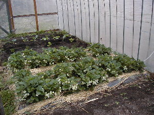 | 農家では秋にビニールを外し、雪解け頃から苗を育てるために張り直します。この付近ではハウスもの栽培はほとんどやっていないようです。当家のビニールハウスはイチゴのために一年中張りっぱなしです。雨や雪にあたらないので嫌地成分が溜まってしまうのではないかと思っていますがまだ2年目ですので大丈夫でしょう。今年は上の段に畑を開墾し、そちらに主な作物を植えるつもりです。 | ||
