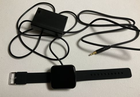 ●腕時計ケース内にタッチセンサと振動モータがあり、感知すると振動する。同時にミニジャックがONとなる。