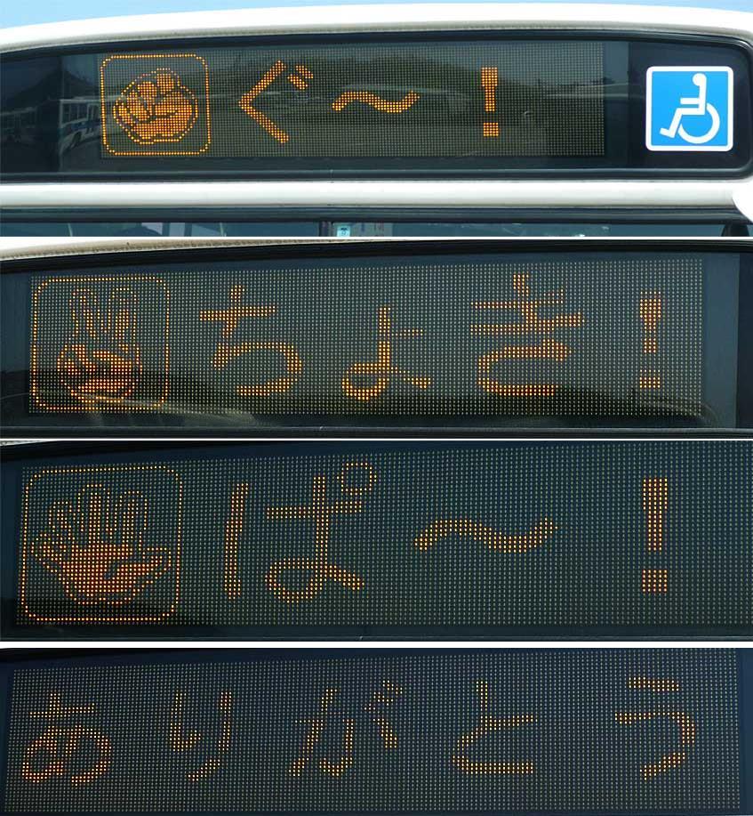 バスがやってきたら方向幕で行先を確認しましょう ![]() 基本の方向幕はこんなかんじです。各ターミナルから出発する便には系統番号が 書いてあったりします 基本的に2ケタまでは市内線、3ケタは郊外線に割り当てられていますが、近場の 乗降であればべつに気にすることもありません。ただし特急(都城行等)のように一定の バス停まで乗車専用で降りられない、なんて路線もありますのでそれだけ注意です ![]() これはピクトグラム入りのもの。いまひとつピンときません。鉄道マークは JR宮崎駅と南宮崎駅、バスマークは宮交シティバスセンターに寄ることを表しています 宮崎駅や宮交シティなどターミナル行きのバスには系統番号は付かない場合があります ![]() 温泉マーク付きもありました ![]() 最近の新車は電光表示タイプになっています ![]() 1ドア車の小型方向幕は文字が小さめです。情報も若干省略されている気もします ![]() 回送中のバスはこういう表示が出てます ![]() とてもレアな「すんません」幕。1台だけ?しか仕込まれていません (表示させない方針になったそうです 2017年6月) 系統番号を含めた宮崎市地区の方向幕一覧の画像ページを作ってみました。全部は 揃ってはいませんが現行の7割方は収められたと思います。見たい方ここをクリック ![]() 横の方向幕はこんなかんじです なかにはイベント用の幕が仕込まれているクルマもいるんですよ↓ ![]() ![]() なんとねこバスにもなってしまう! ![]() ![]() 2ドアのバスが多数を占めていまして、中ほどにあるドアから乗り込みます この画像は通常の2段昇るツーステップ車です。ワンステップ、ノンステップの 車両もあります。画像の車両は右側に整理券発行器が付いていますが、 左側に設置してある場合もあります。ワイドドア車では両側に付いてます 乗降扉はこの画像の折戸、下の画像の引戸とあります ![]() これがノンステップバス。踏み込んだ一歩目から床です。中ドアから前ドアまでフラットです そのかわり後部が段々です。ノンステップバスについてはこちらを ![]() 両側に開くワイドドア車では左右両方に付いてたりもします ![]() ドアが前方にひとつしかないバスは前から乗り込みます、まず降りる人が先です この手のバスはみな方向幕が下のほうにある観光車っぽい大きなバスですので 判別はつくと思います ![]() 夜はこういうかんじです。ドア上の蛍光灯が点きます |