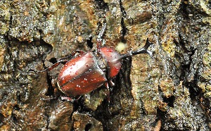 カブトムシ 8月に隣接する林で見つけた、ルビー色のカブトムシです。雨に打たれても懸命に夢中で樹液を吸っていました。「水も滴るいいカブト」です。 |